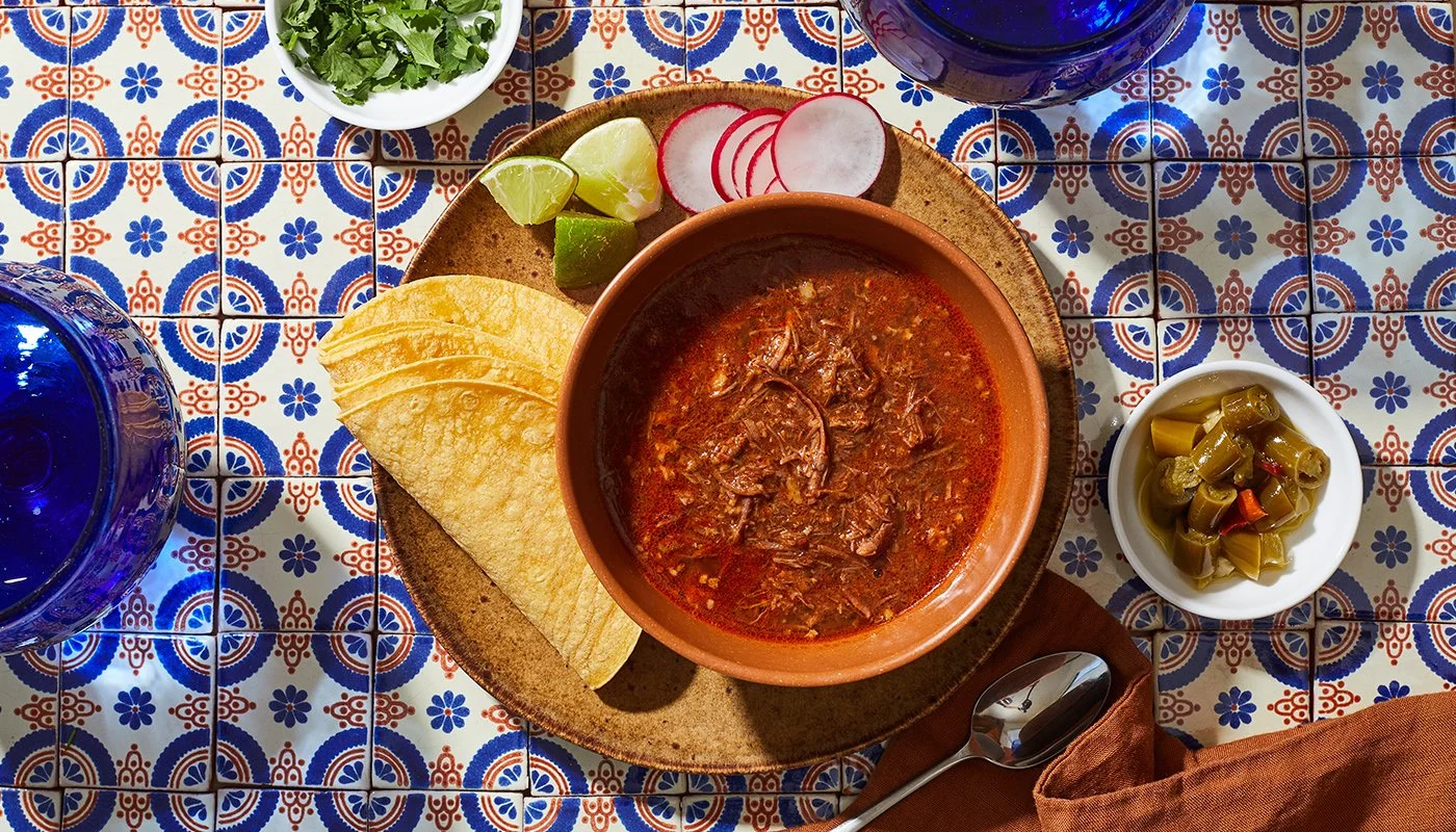 Birria stew with a side of tortilla.