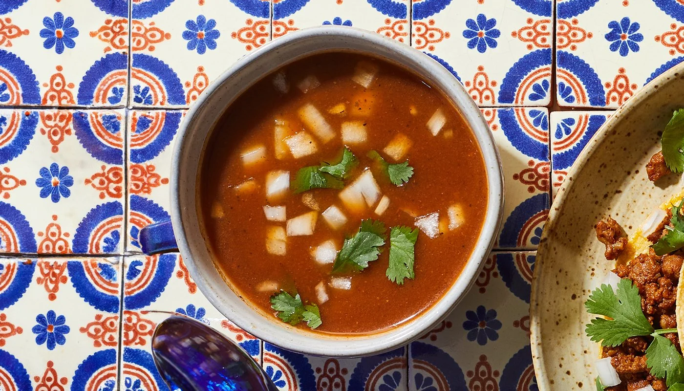 Choice of taco with a side of tomato spice broth.